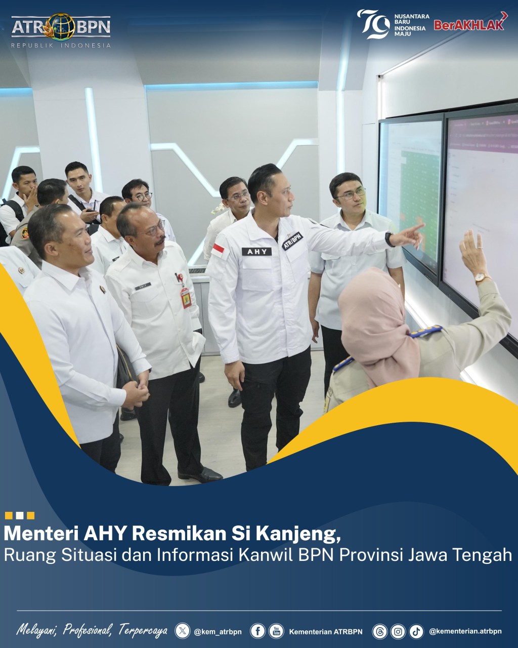 “Kita meresmikan Ruang Si Kanjeng, ‘Situasi dan Informasi Kanwil BPN Provinsi Jawa Tengah’. Semoga ruangan ini bisa menghadirkan kebaikan dan kemajuan dalam berbagai urusan pertanahan dan tata ruang se-Provinsi Jawa Tengah,” ujar Menteri AHY diamini oleh para pegawai yang turut hadir menyaksikan.