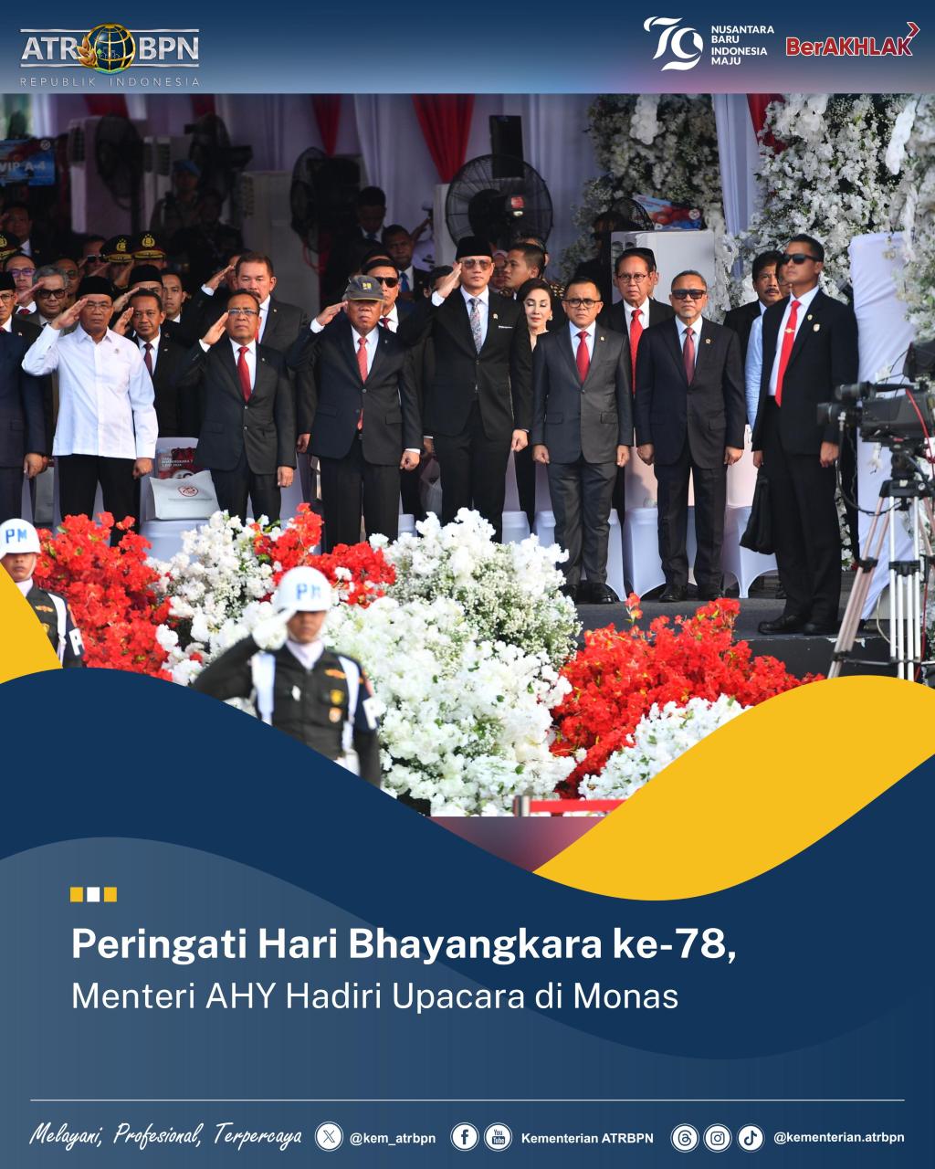 Menteri Agraria dan Tata Ruang/Kepala Badan Pertanahan Nasional (ATR/BPN) Agus Harimurti Yudhoyono (AHY) menghadiri Upacara dan Syukuran Hari Bhayangkara ke-78 di Lapangan Silang Monas, Senin (01/07/2024). Upacara ini dipimpin langsung oleh Presiden Republik Indonesia (RI), Joko Widodo.