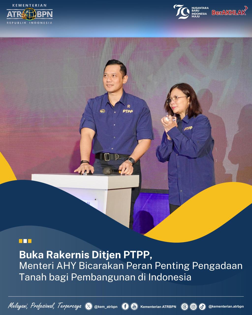 Jakarta – Menteri Agraria dan Tata Ruang/Kepala Badan Pertanahan Nasional (ATR/BPN), Agus Harimurti Yudhoyono (AHY) menyebut bahwa peran Pengadaan Tanah begitu besar dalam pembangunan, baik untuk pembangunan yang tergolong Proyek Strategis Nasional (PSN) maupun Non-PSN di seluruh Indonesia. Hal ini ia sampaikan saat membuka Rapat Kerja Teknis (Rakernis) Direktorat Jenderal Pengadaan Tanah dan Pengembangan Pertanahan (Ditjen PTPP) di Pullman Jakarta Central Park pada Rabu (07/08/2024).
