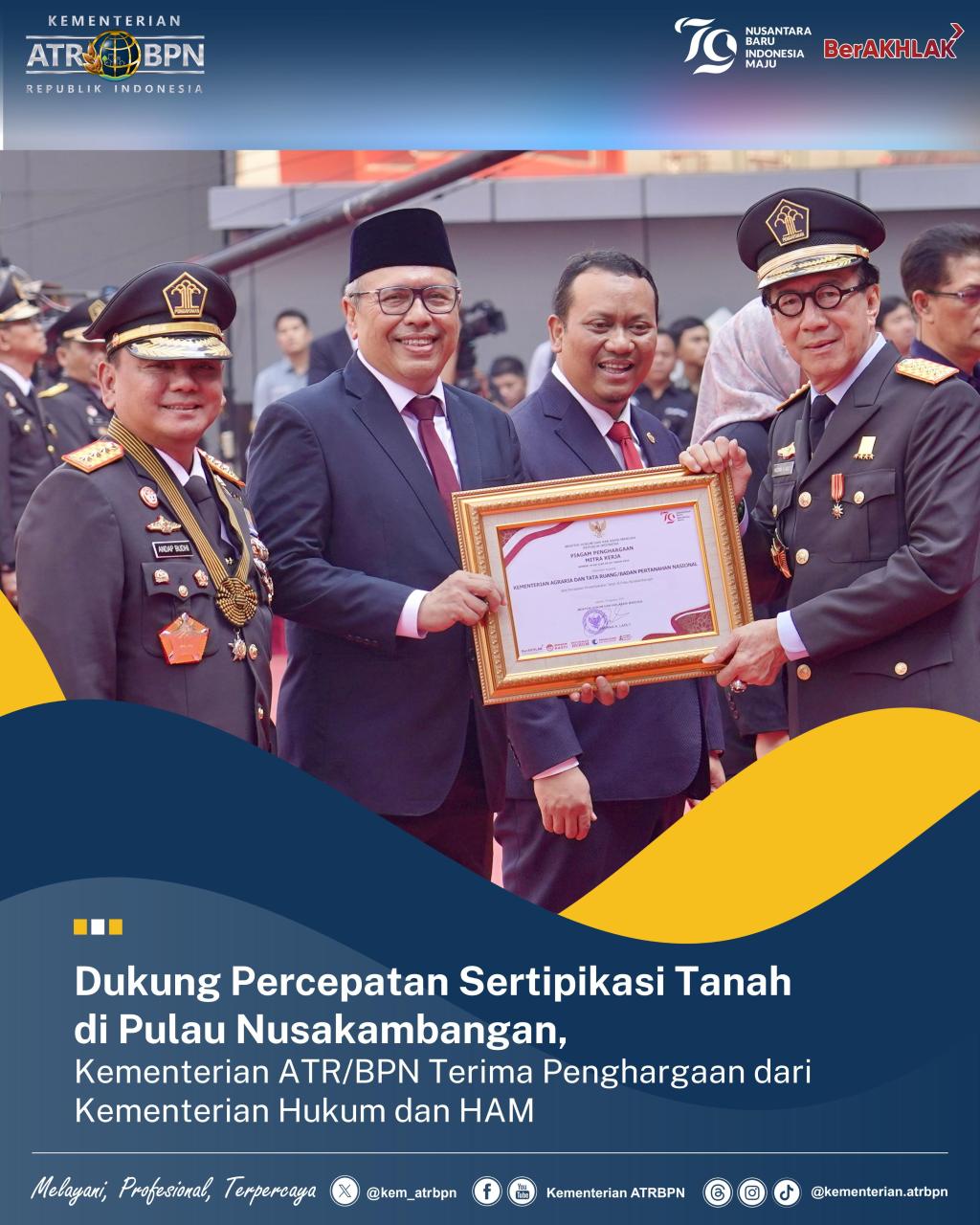 akarta – Kementerian Agraria dan Tata Ruang/Badan Pertanahan Nasional (ATR/BPN) menerima Piagam Penghargaan Mitra Kerja atas Percepatan Penyertipikatan Tanah di Pulau Nusakambangan. Sekretaris Jenderal (Sekjen) Kementerian ATR/BPN, Suyus Windayana yang hadir mewakili Menteri ATR/Kepala BPN, Agus Harimurti Yudhoyono (ATR/BPN) menerima penghargaan tersebut pada saat Upacara Hari Pengayoman ke-79 Tahun 2024 di Lapangan Kementerian Hukum dan Hak Asasi Manusia (HAM), Jakarta, Senin (19/08/2024).