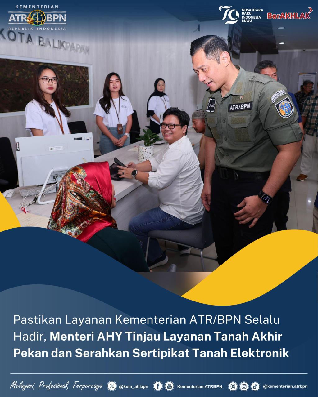 Peninjauan dilakukan untuk memastikan jajaran ATR/BPN selalu siap melayani masyarakat, termasuk saat akhir pekan. Di Kantah Kota Balikpapan, Menteri AHY juga menyerahkan 20 Sertipikat Tanah Elektronik bagi lembaga pemerintah maupun masyarakat.