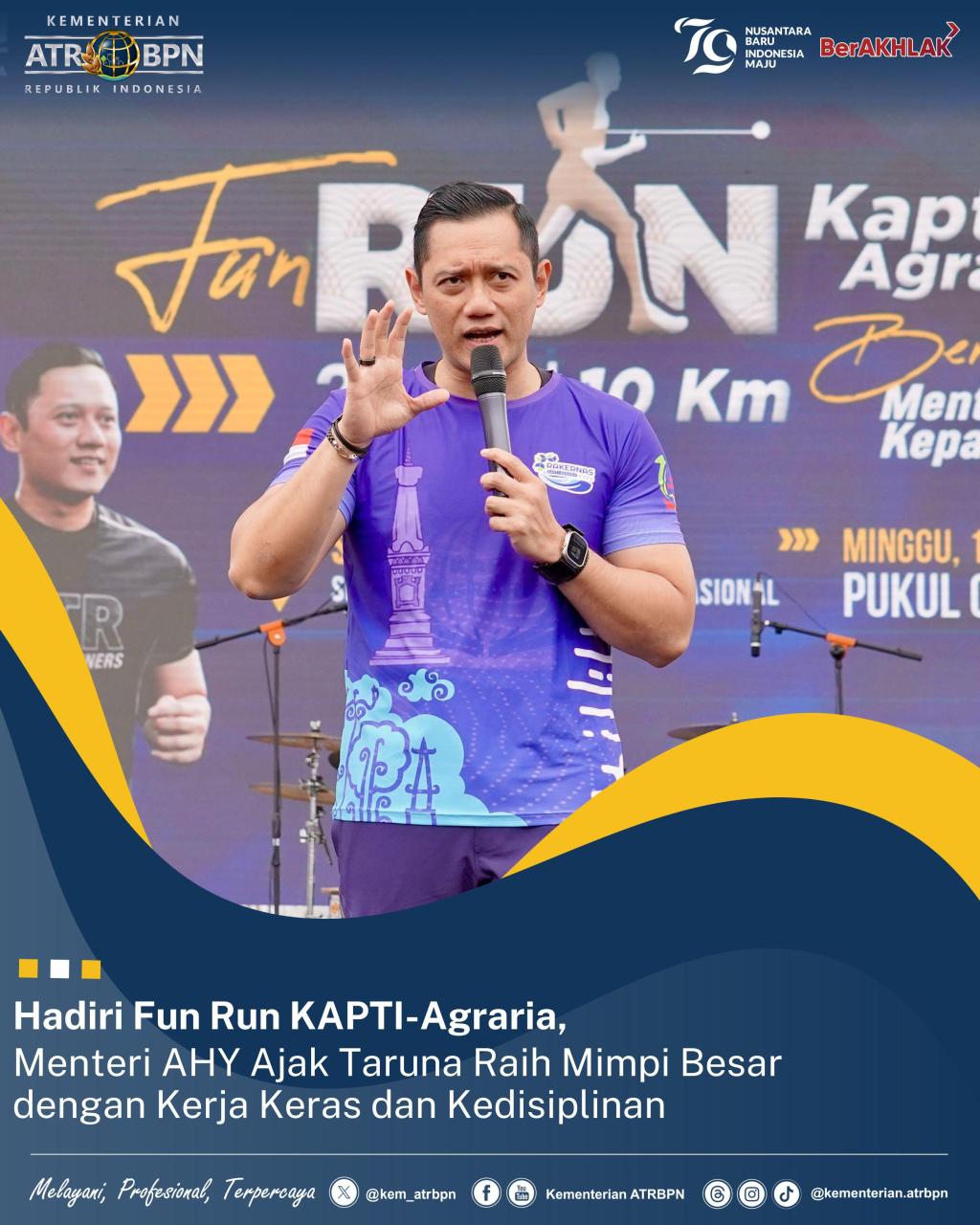 Sleman – Menteri Agraria dan Tata Ruang/Kepala Badan Pertanahan Nasional (ATR/BPN), Agus Harimurti Yudhoyono (AHY) hadir dalam Fun Run Keluarga Alumni Pendidikan Tinggi Agraria (KAPTI-Agraria) yang berlangsung di Sekolah Tinggi Pertanahan Nasional (STPN) Yogyakarta, Kabupaten Sleman, Minggu (01/09/2024). Ia menyapa peserta sekaligus memberikan motivasi kepada taruna STPN yang mengikuti Fun Run.