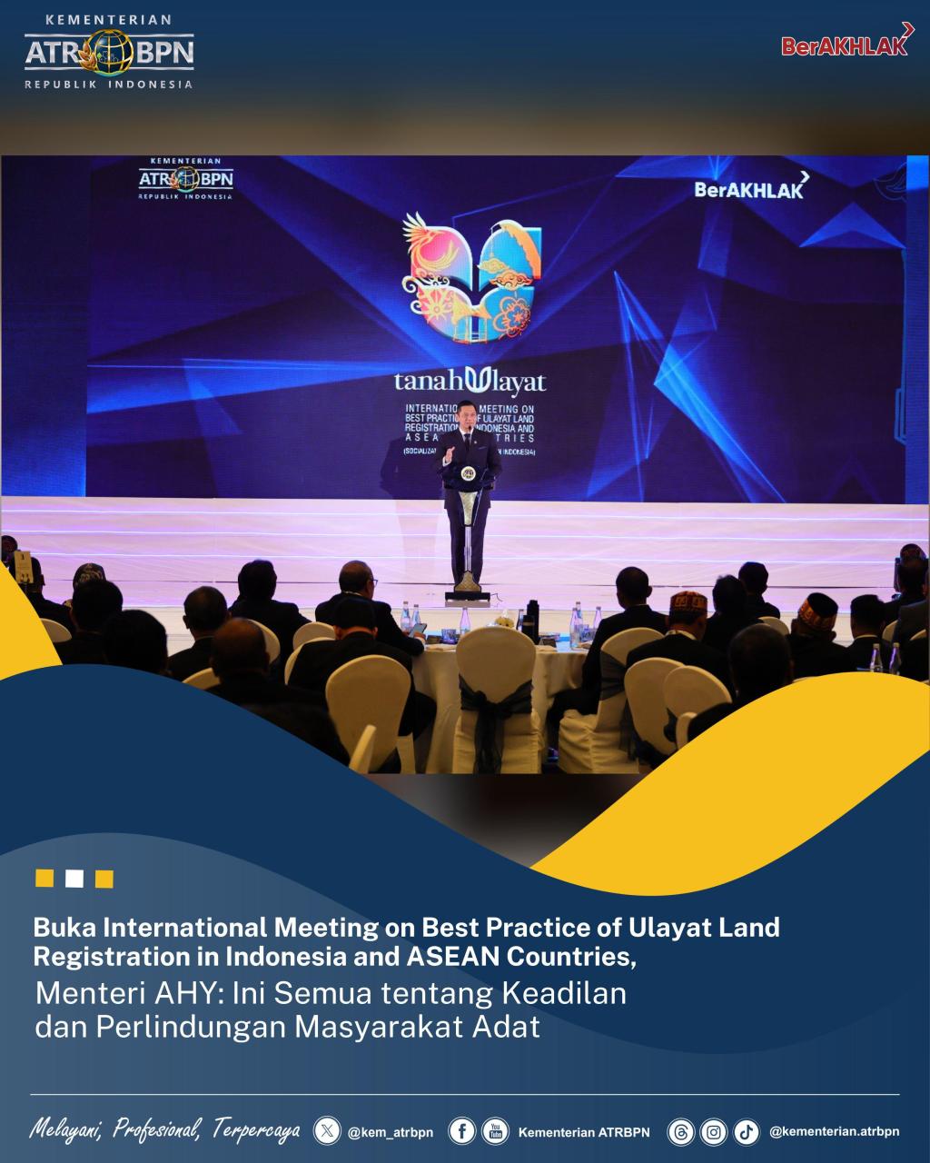 Bandung – Menteri Agraria dan Tata Ruang/Kepala Badan Pertanahan Nasional (ATR/BPN), Agus Harimurti Yudhoyono (AHY) resmi membuka International Meeting on Best Practices of Ulayat Land Registration in Indonesia and ASEAN Countries di The Trans Luxury Hotel, Bandung, Kamis (05/09/2024). Konferensi Internasional ini digelar untuk membahas terkait perlindungan Masyarakat Hukum Adat atas tanah ulayat di Indonesia maupun di negara-negara ASEAN.