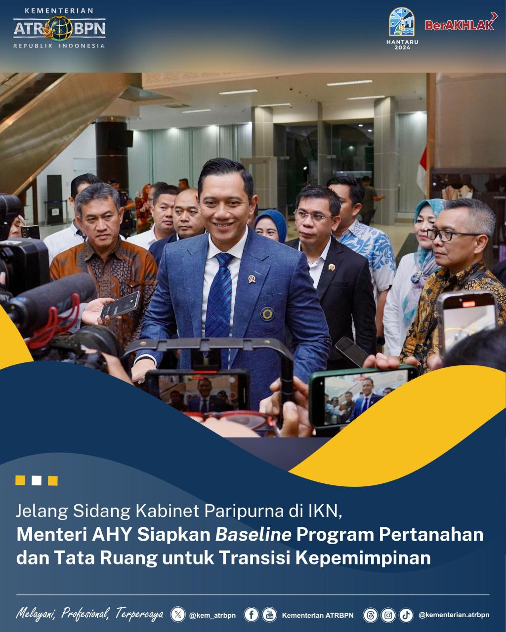 “Saya senang bisa kembali ke Balikpapan, dari Surabaya langsung tadi. Setelah ini langsung menuju ke IKN. Besok akan digelar Sidang Kabinet Paripurna membahas berbagai hal strategis, yang saya tahu tentang transisi kepemimpinan dari Pak Presiden Joko Widodo ke Bapak Presiden Terpilih, Pak Prabowo Subianto. Ini penting, sebuah fase yang perlu kita kawal bersama,” ujar Menteri AHY.