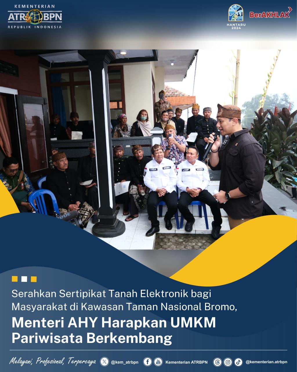 Probolinggo – Pada Kamis (26/09/2024) siang, setelah menyerahkan sertipikat di Kabupaten Pasuruan, Menteri Agraria dan Tata Ruang/Kepala Badan Pertanahan Nasional (ATR/BPN), Agus Harimurti Yudhoyono (AHY) langsung melanjutkan perjalanannya ke Kabupaten Probolinggo, Jawa Timur. Dengan menyetir mobilnya sendiri, ia tiba di Desa Ngadisari, Kecamatan Sukapura yang berada di kawasan Taman Nasional Bromo Tengger Semeru untuk menyerahkan 30 Sertipikat Tanah Elektronik hasil program Pendaftaran Tanah Sistematis Lengkap (PTSL).