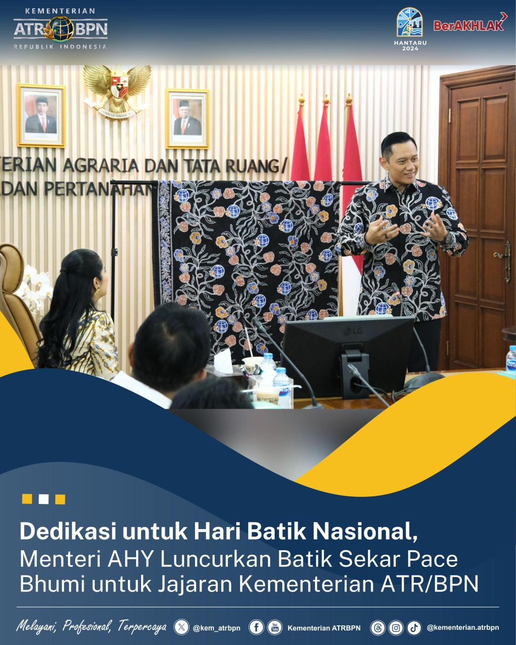 “Di hari batik ini didesainkan batik khusus, yang menjadi bagian dari memori dan dedikasi Kementerian ATR/BPN terhadap hari batik. Batik ini didesain khusus oleh Annisa, yang di beri nama Batik Sekar Pace Bhumi, yang bentuknya seperti yang saya kenakan ini,” ucap Menteri AHY sembari menunjuk baju batik yang ia kenakan pada pertemuan yang berlangsung di Ruang Rapat Menteri, pada Rabu (02/10/2024).