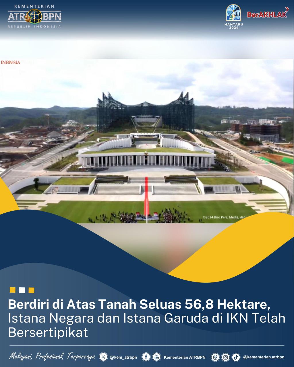 Nusantara – Istana Negara dan Istana Garuda yang menjadi kebanggaan bangsa Indonesia kini resmi bersertipikat. Sertipikat Tanah Elektronik berupa Hak Pakai telah diserahkan oleh Menteri Agraria dan Tata Ruang/Kepala Badan Pertanahan Nasional (ATR/BPN), Agus Harimurti Yudhoyono (AHY) kepada Menteri Sekretaris Negara, Pratikno dan disaksikan oleh Presiden Republik Indonesia, Joko Widodo (Jokowi), Jumat (11/10/2024).