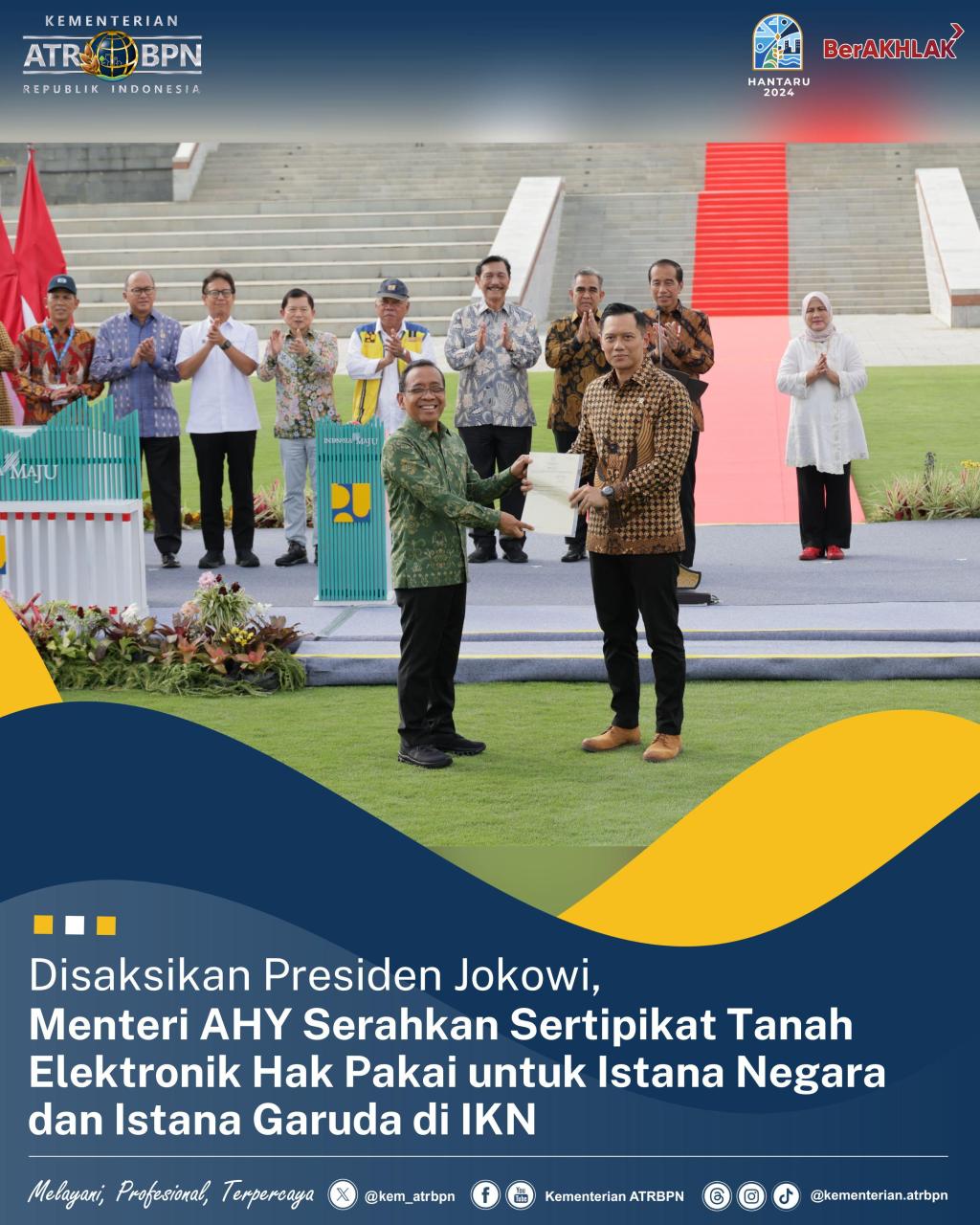 Nusantara – Menteri Agraria dan Tata Ruang/Kepala Badan Pertanahan Nasional (ATR/BPN), Agus Harimurti Yudhoyono (AHY) mendampingi Presiden Joko Widodo dalam Peresmian Istana Negara di Ibu Kota Nusantara (IKN), Provinsi Kalimantan Timur, Jumat (11/10/2024). Dalam kesempatan ini, Menteri AHY menyerahkan Sertipikat Tanah Elektronik berupa Hak Pakai untuk Istana Negara dan Istana Garuda kepada Menteri Sekretaris Negara, Pratikno di hadapan Presiden Joko Widodo.