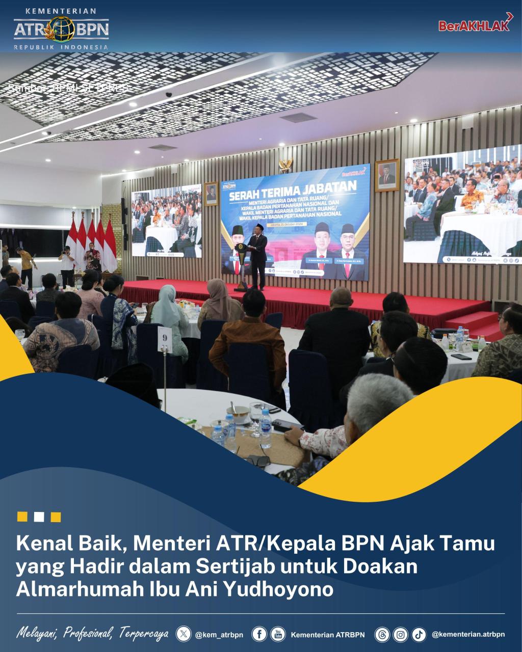 Jakarta – Mengawali sambutannya dalam acara Serah Terima Jabatan, Senin (21/10/2024) di Kantor Kementerian ATR/BPN, Jakarta, Menteri Agraria dan Tata Ruang/Kepala Badan Pertanahan Nasional (ATR/BPN), Nusron Wahid mengajak seluruh tamu yang hadir untuk mengirim doa bagi Alm. Ibu Ani Yudhoyono.