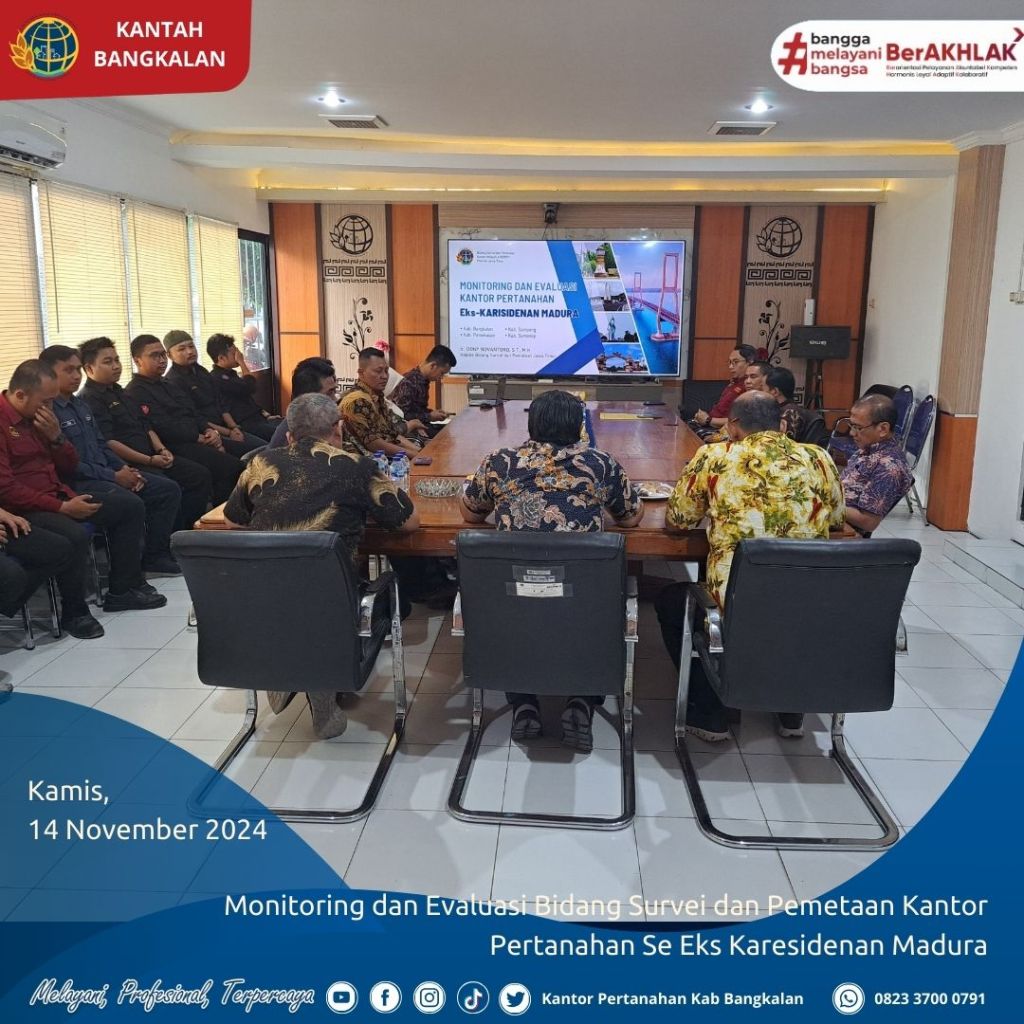 Kamis 14 November 2024 Kantor Wilayah Badan Pertanahan Nasional ( BPN ) Provinsi Jawa Timur melaksanakan Monitoring dan Evaluasi Bidang Survei dan Pemetaan Kantor Pertanahan Se Eks Karesidenan Madura di Kantor Pertanahan Kabupaten Bangkalan.