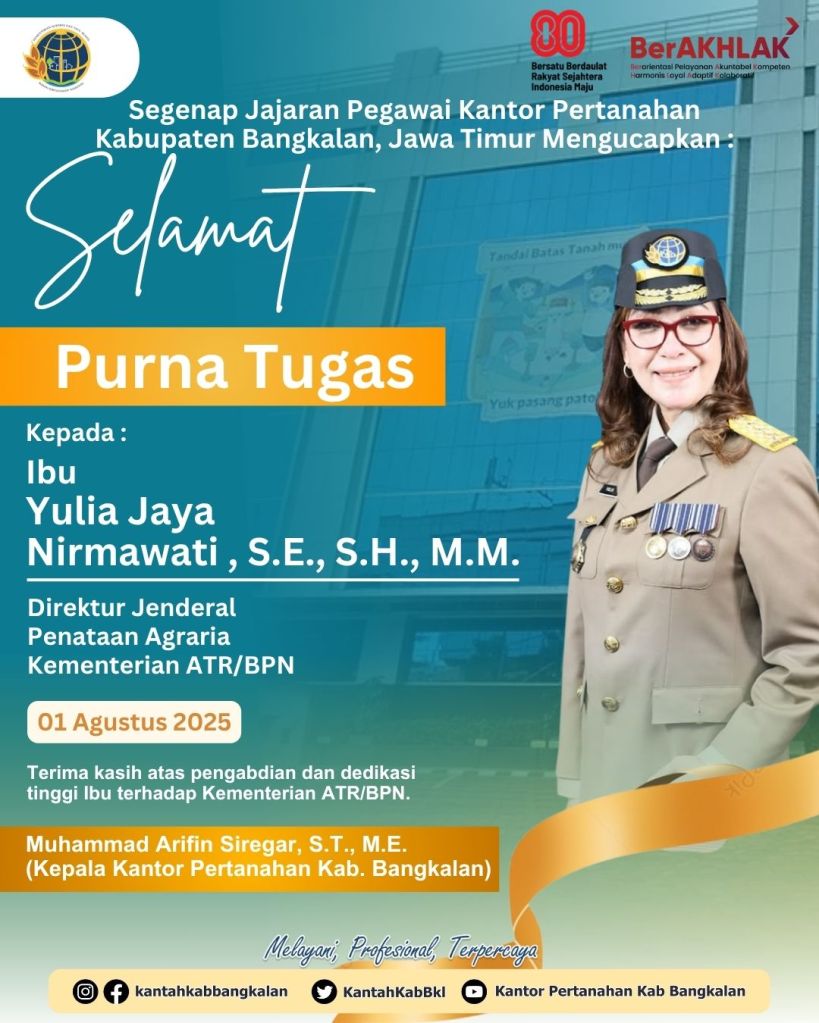 Kepala Kantor Pertanahan Kabupaten Bangkalan Bapak Muhammad Arifin Siregar, S.T., M.E. dan Segenap Pegawai Kantor Pertanahan Kabupaten Bangkalan mengucapkan Selamat Purna Tugas Ibu Direktur Jenderal Penataan Agraria, Yulia Jaya Nirmawati, S.E., S.H., M.M.