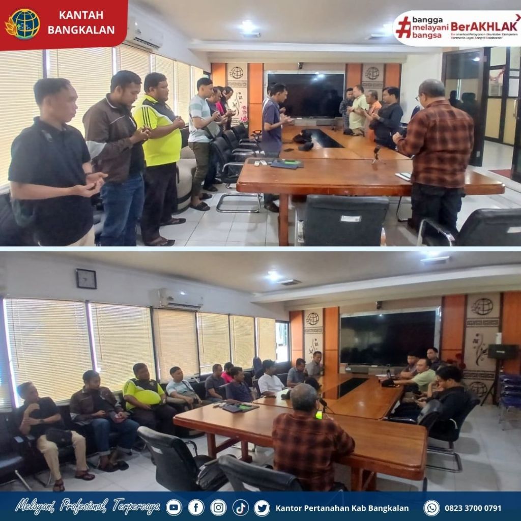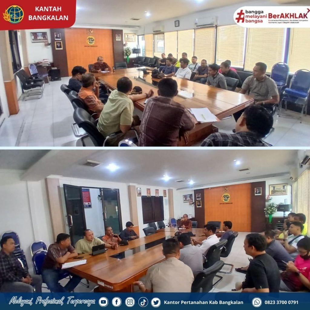 Rapat dipimpin langsung oleh Kepala Kantor Pertanahan Kabupaten Bangkalan Bapak Muhammad Arifin Siregar, S.T., M.E. dan dihadiri oleh jajaran pejabat struktural, tim teknis, serta petugas lapangan yang akan ditugaskan dalam kegiatan tersebut.