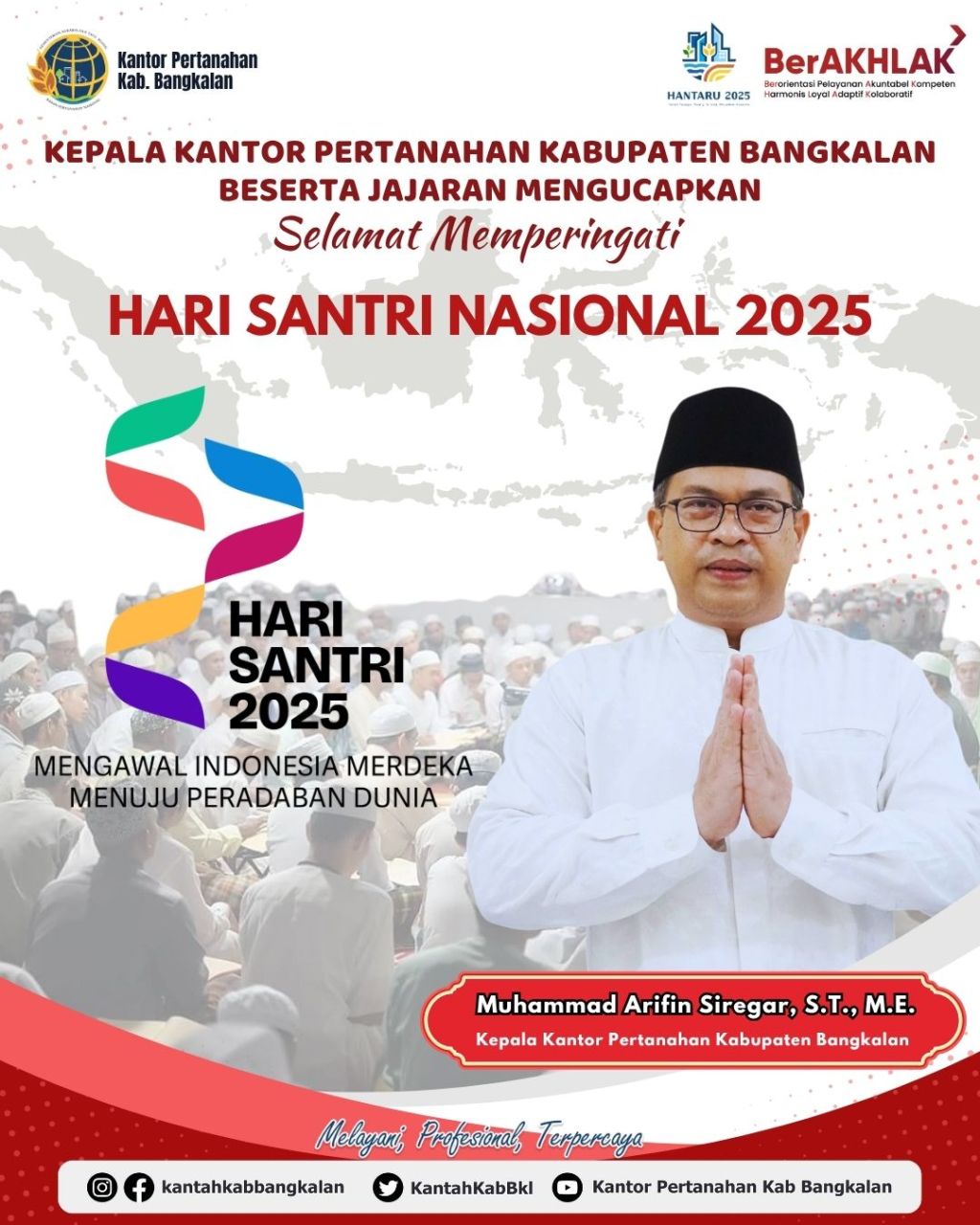 Kepala Kantor Pertanahan Kabupaten Bangkalan beserta jajaran mengucapkan terima kasih kepada seluruh santri yang telah menjadi garda moral bangsa — menjaga nilai, memperkuat iman, dan berkontribusi dalam membangun peradaban Indonesia yang maju dan berkeadaban.