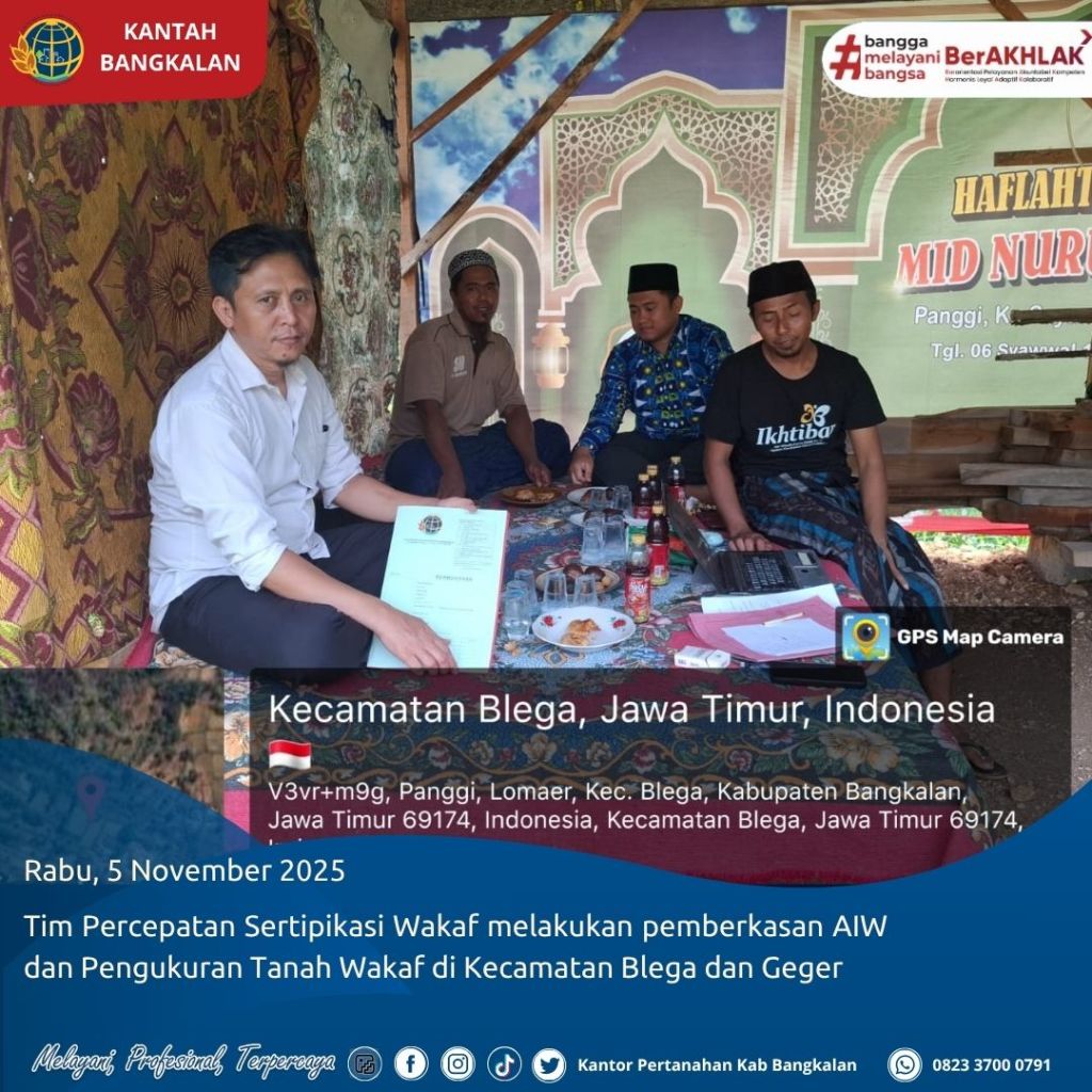 Tim Percepatan Sertipikasi Wakaf Kantor Pertanahan Kabupaten Bangkalan melaksanakan kegiatan pemberkasan AIW (Akta Ikrar Wakaf) serta pengukuran tanah wakaf di Kecamatan Blega dan Kecamatan Geger. Kegiatan ini dilakukan sebagai bagian dari percepatan penyelesaian sertipikasi tanah wakaf untuk memberikan kepastian hukum atas aset-aset wakaf yang dimanfaatkan bagi kepentingan umat.