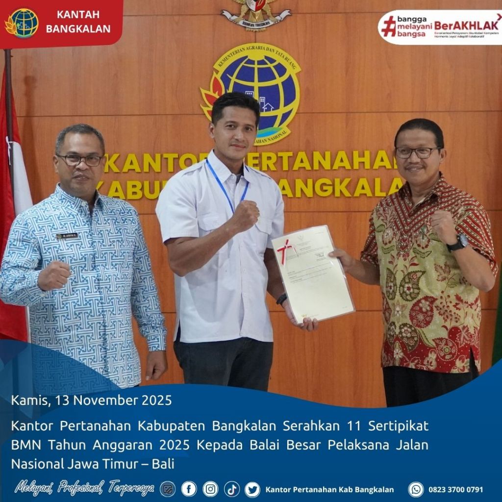 Halo #SobatATRBPN | Bangkalan, [13/11/2025] – Kantor Pertanahan Kabupaten Bangkalan melaksanakan kegiatan Penyerahan Sertipikat Barang Milik Negara (BMN) Tahun Anggaran 2025 kepada Balai Besar Pelaksana Jalan Nasional (BBPJN) Jawa Timur – Bali.