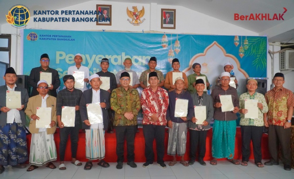 Bangkalan, 12 Maret 2026 – Kantor Pertanahan Kabupaten Bangkalan melaksanakan kegiatan penyerahan sertipikat tanah wakaf yang berlangsung pada Kamis (12/3/2026) di Kantor Pertanahan Kabupaten Bangkalan. Kegiatan ini merupakan bagian dari upaya pemerintah dalam memberikan kepastian hukum terhadap tanah wakaf serta mendukung optimalisasi pemanfaatannya bagi kepentingan umat.