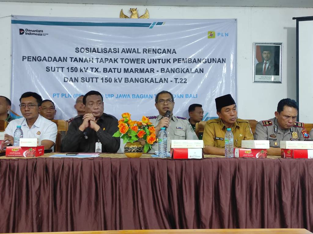 PT PLN (Persero) UIP Jawa Bagian Timur dan Bali (JBTB) melalui UPP JBTB 2 menggelar sosialisasi rencana pembangunan Saluran Udara Tegangan Tinggi (SUTT) 150 kV yang menghubungkan Batu Marmar, Bangkalan dan Gili Timur, Bangkalan. Kepala Kantor Pertanahan Kabupaten Bangkalan Muhammad Arifin Siregar, S.T., M.E., menghadiri kegiatan tersebut bersama jajaran Forkopimcam dan tokoh masyarakat setempat di Kecamatan Burneh, Senin (13/4/2026).
