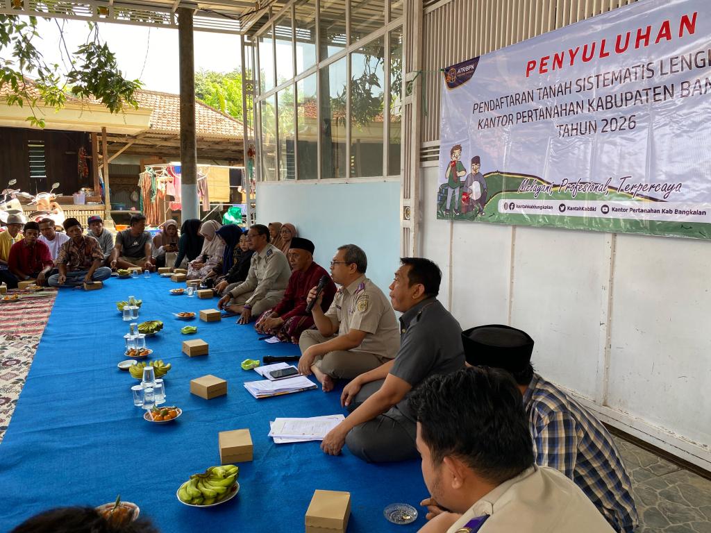 Kepala Kantor Pertanahan Kabupaten Bangkalan Muhammad Arifin Siregar, S.T., M.E., beserta jajaran melaksanakan kegiatan Penyuluhan Pendaftaran Tanah Sistematis Lengkap (PTSL) Integrated Land Aministration and Spatial Planning Project (ILASPP) Tahun Anggaran 2026 yang bertempat di Desa Kompol, Kecamatan Geger, Senin (20/4/2026).